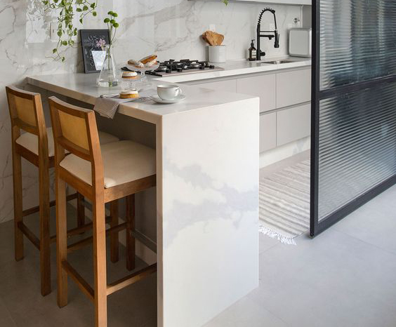 Барные стойки эконом выполняются из кварцевого агломерата или акрила. Несмотря на невысокую стоимость, они не уступают по эстетичности и практичности дорогим аналогам. Конструкция изготавливается различных форм, размеров, цветов и текстур, что позволяет подобрать вариант для любого помещения.