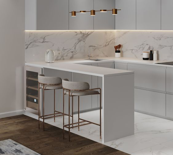 Барные стойки буквой «П» устанавливаются в просторных кухнях и гостиных, либо в уютных квартирах-студиях. Благодаря монтажу конструкции значительно увеличивается количество рабочих поверхностей и мест для хранения инвентаря, кухонных гаджетов и посуды. Высокая столешница может заменить обеденный стол для небольшой компании.